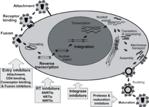 HIV main target are lymphocyte known as T4 helper cells. Infection leads to binding of the glycoprotein to the T4 helper cell. This is followed by the uptake of the viral particles into the cells of the host. This largely destroys the T cells and block their ability to recognize foreign material before dividing into the T cells. Micro phages monocytes as well as cell of the brain and spinal cord also carries the CD4 molecules of the glycoprotein. The replication of the H.I.V process through the following stages.